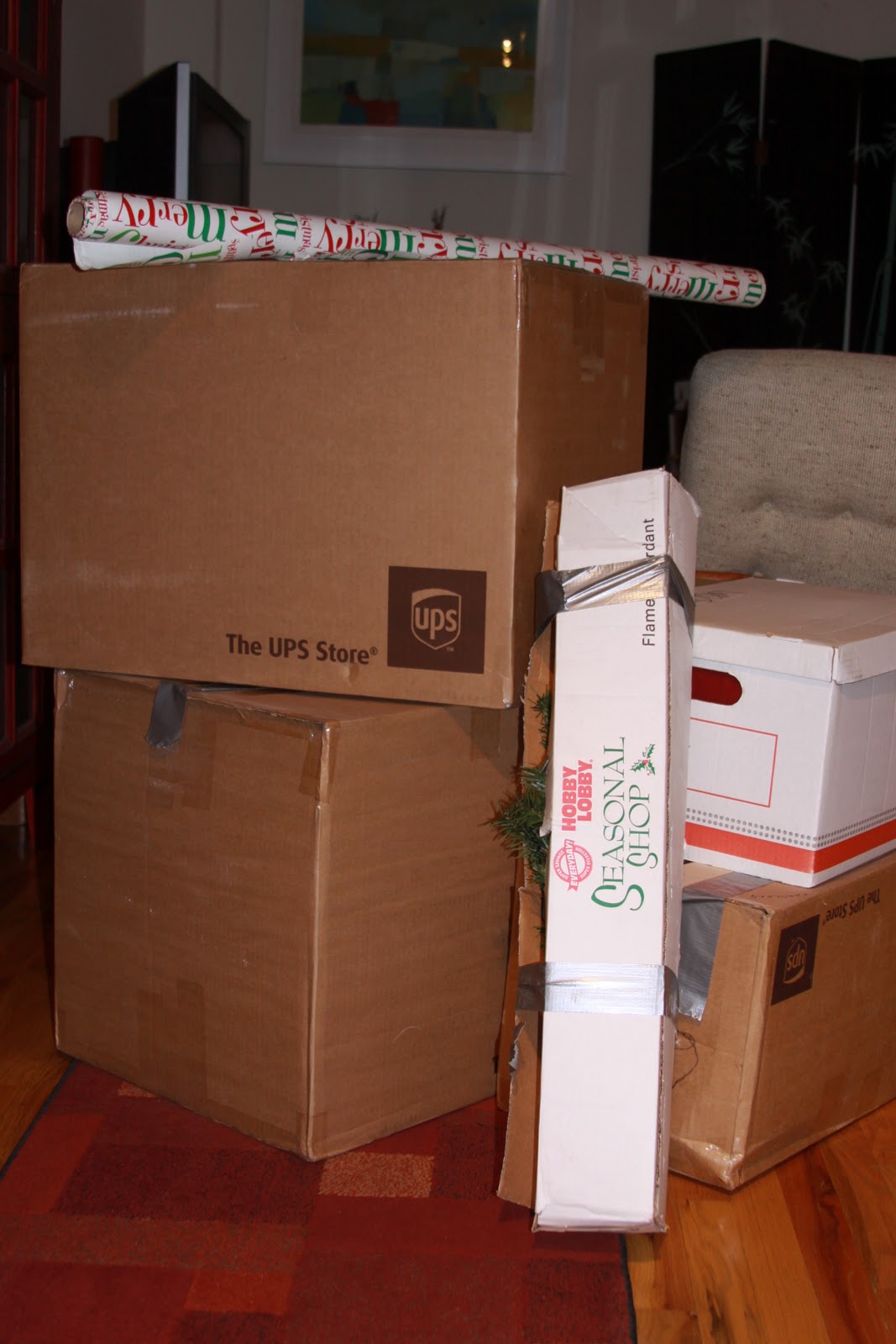 Since I had the day off today, I decided to get a head start on decorating our loft with Christmas decorations. I luvvvvv Christmas. Our place is small, about 1000 sq. feet, so we keep the majority of our stuff in storage. I am always amazed by the amount of boxes I stuff organize in such a condensed space.
