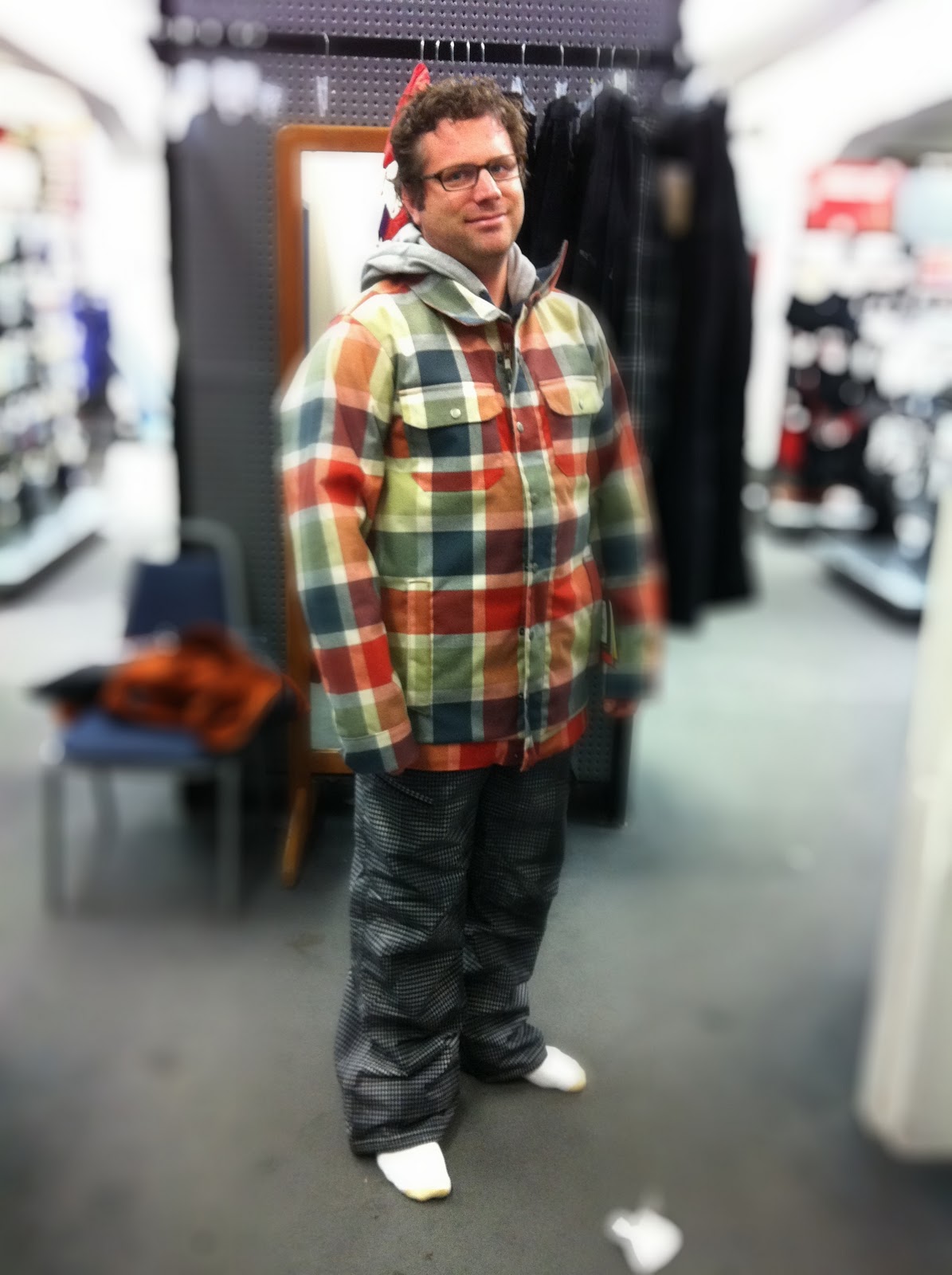 Once we were done with REI, we jetted over to Sports Authority to look for some new ski attire for Mr. B. He definitely needs an upgrade.
