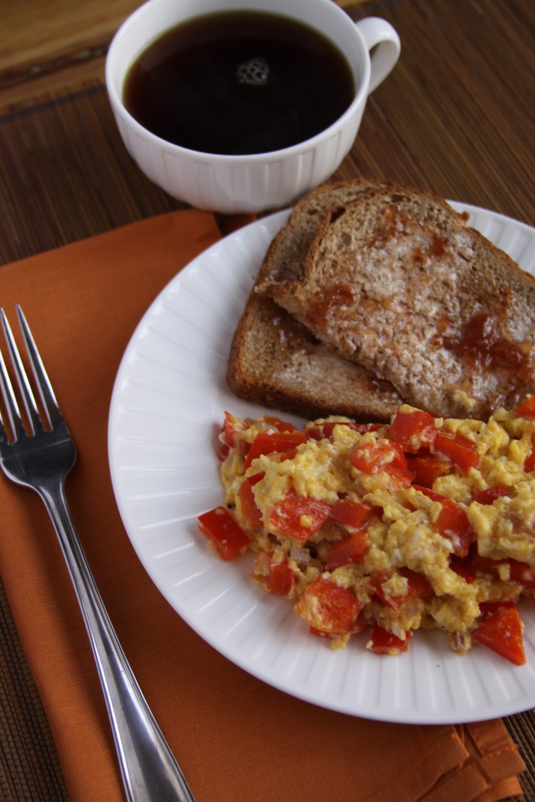 A slice of whole wheat toast covered in strawberry jam. Scrambled or sunny side up eggs. And a cup of dark coffee with a splash of half-n-half and a scoop of sugar.