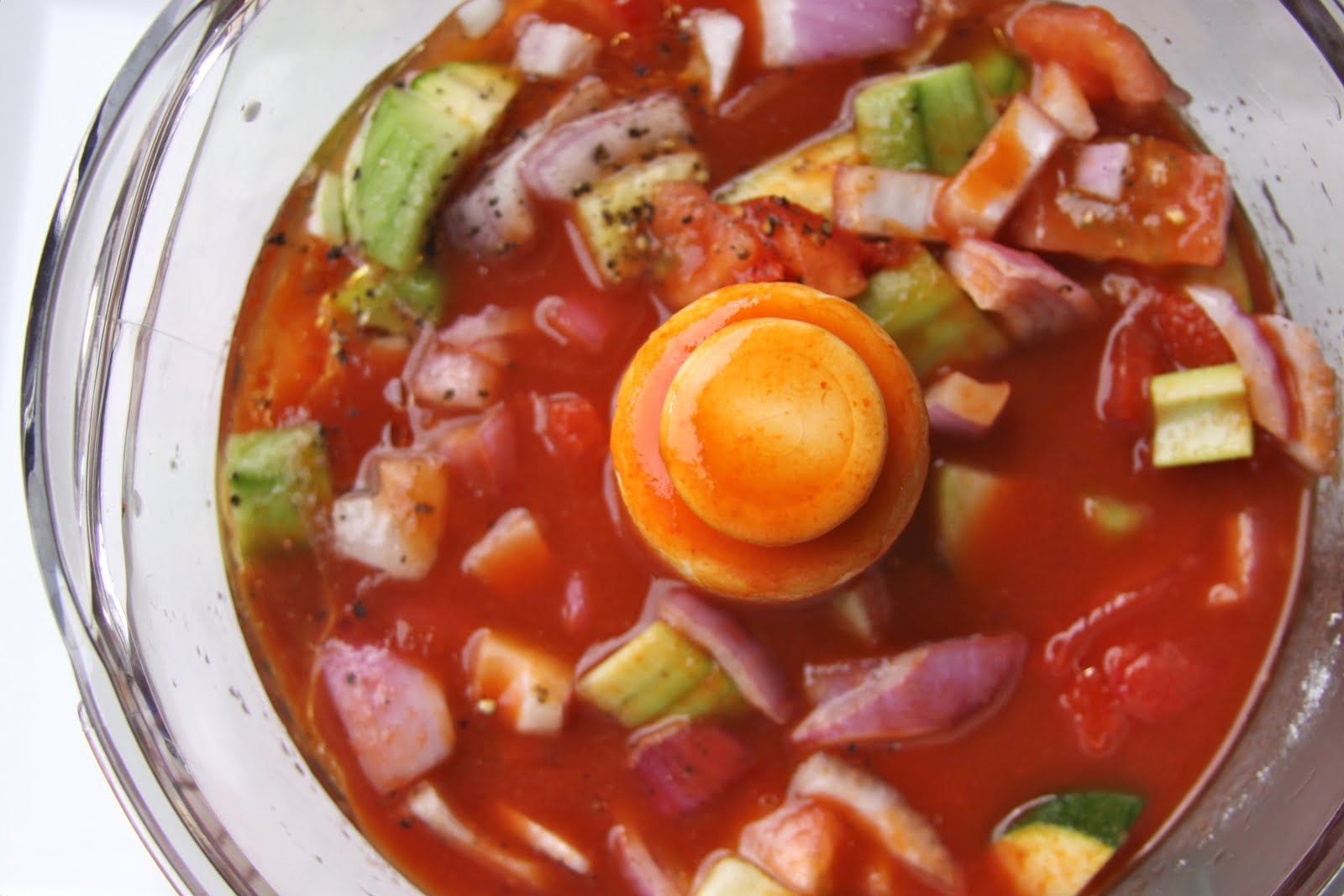 Pulse until ingredients are blended well; mixture will have a nice speckled, colorful texture. Pour into a large bowl and add the rest of the tomato juice, and half of the remaining onion, cucumber, tomato, zucchini, and celery. (Reserve the rest of the diced vegetables for garnish).