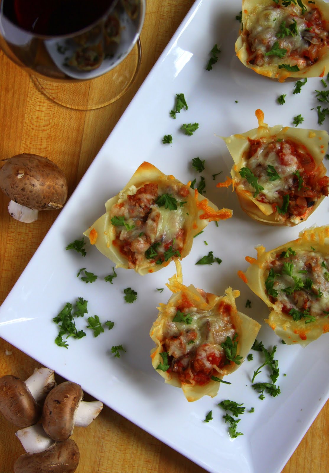 Coat a 12-cup muffin tin with nonstick cooking spray. Place 1 wonton wrapper into each of the 12 cups, pressing firmly in the bottom of the cup and up the sides. Using half of the ricotta mixture, divide it among the 12 muffin cups. Next, using half of the turkey tomato sauce, spoon it evenly over each of the ricotta filled cups. Sprinkle with 2 teaspoons of mozzarella.