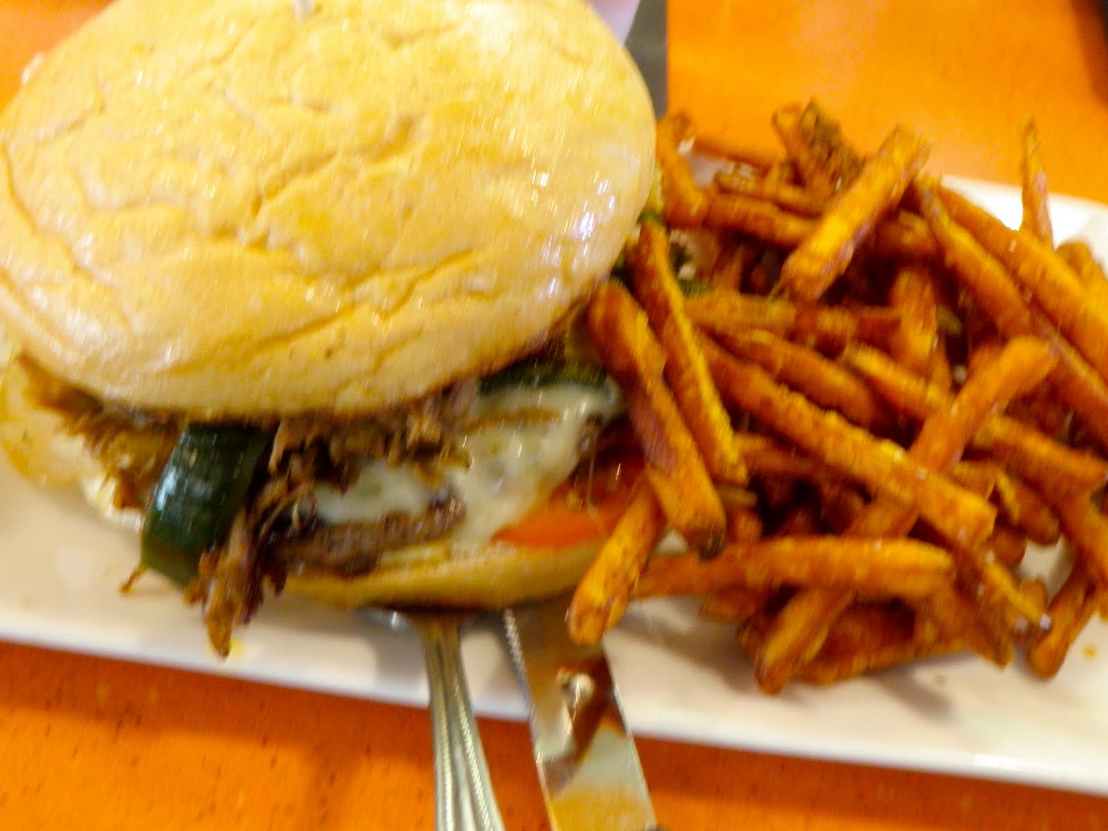 I had the Colorado Burger: shredded lamb, poblanos, onions, pepper jack, avocado, chipotle mayo and tomato. And of course, sweet potato fries!