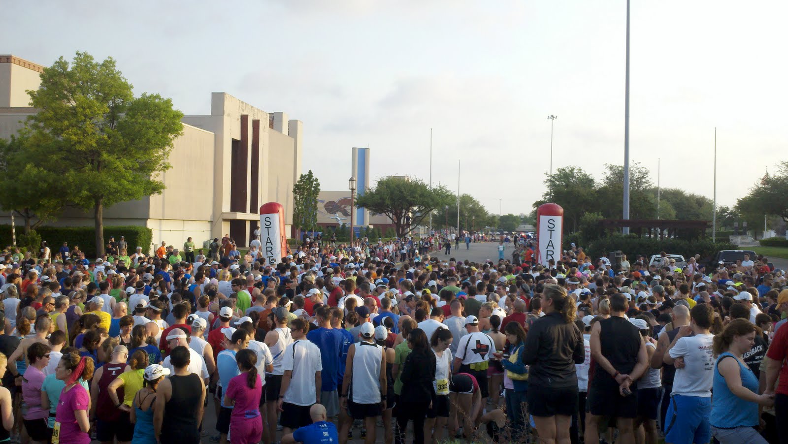The race started at the Texas State Fairgrounds by the Cotton Bowl. It didn’t take long to get there from our hotel but the traffic to try and park was ridiculous! I snapped this picture of the fairgrounds while we were waiting to exit I-30.