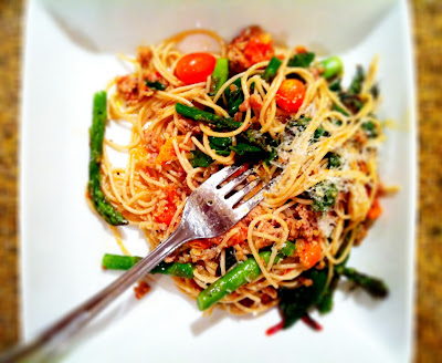 Dinner tonight was inspired by one of my favorite new food blogs, Bev Cooks. Love her. Not only is she witty, her recipes are super simple and delicious. Anyways, I made her Angel Hair Pasta with Chicken Sausage, Kale and Tomatoes a few months ago, and thought it would be a nice light dish before the big game.