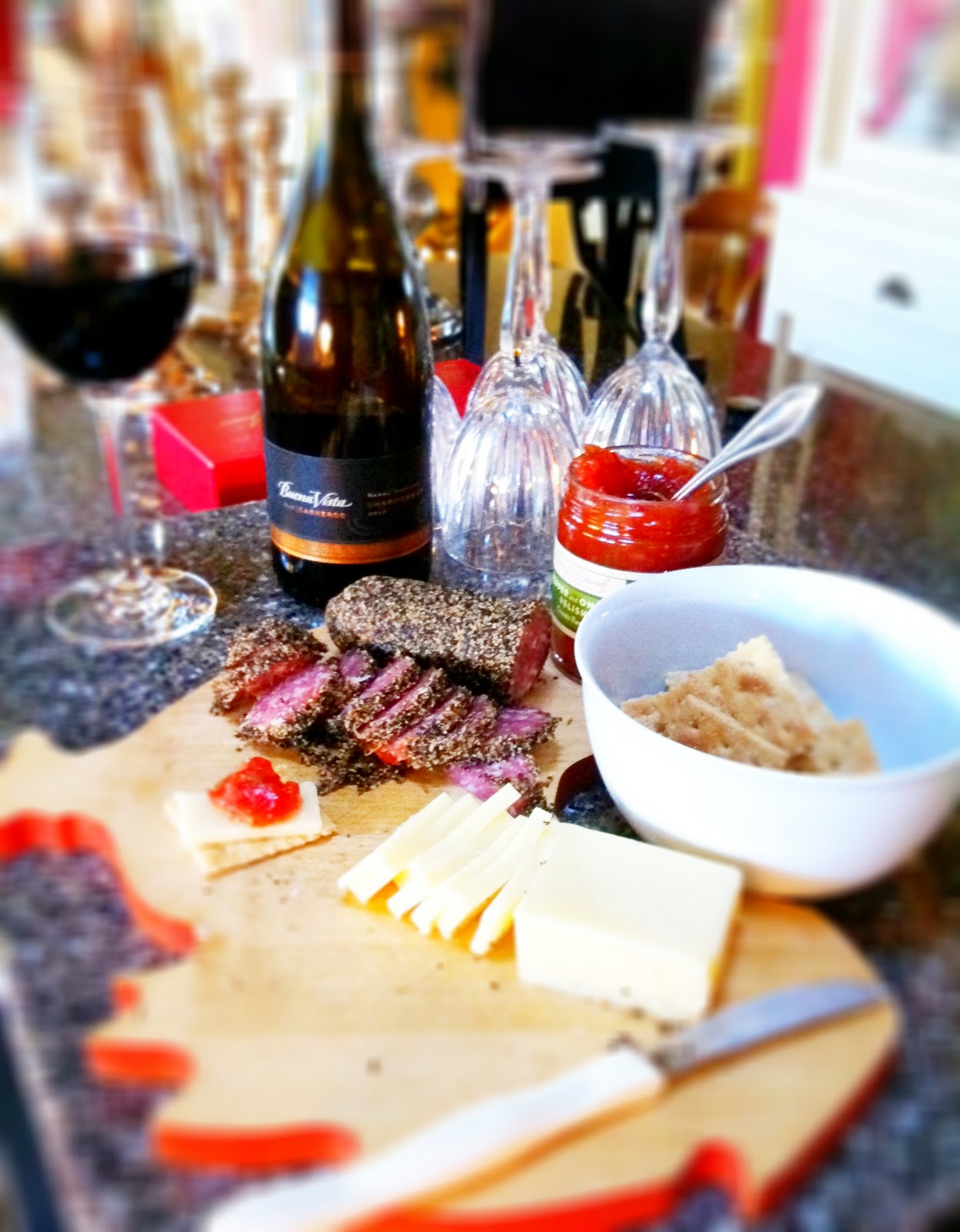 We snacked on crackers, white cheddar cheese, peppered salami and tomato relish.