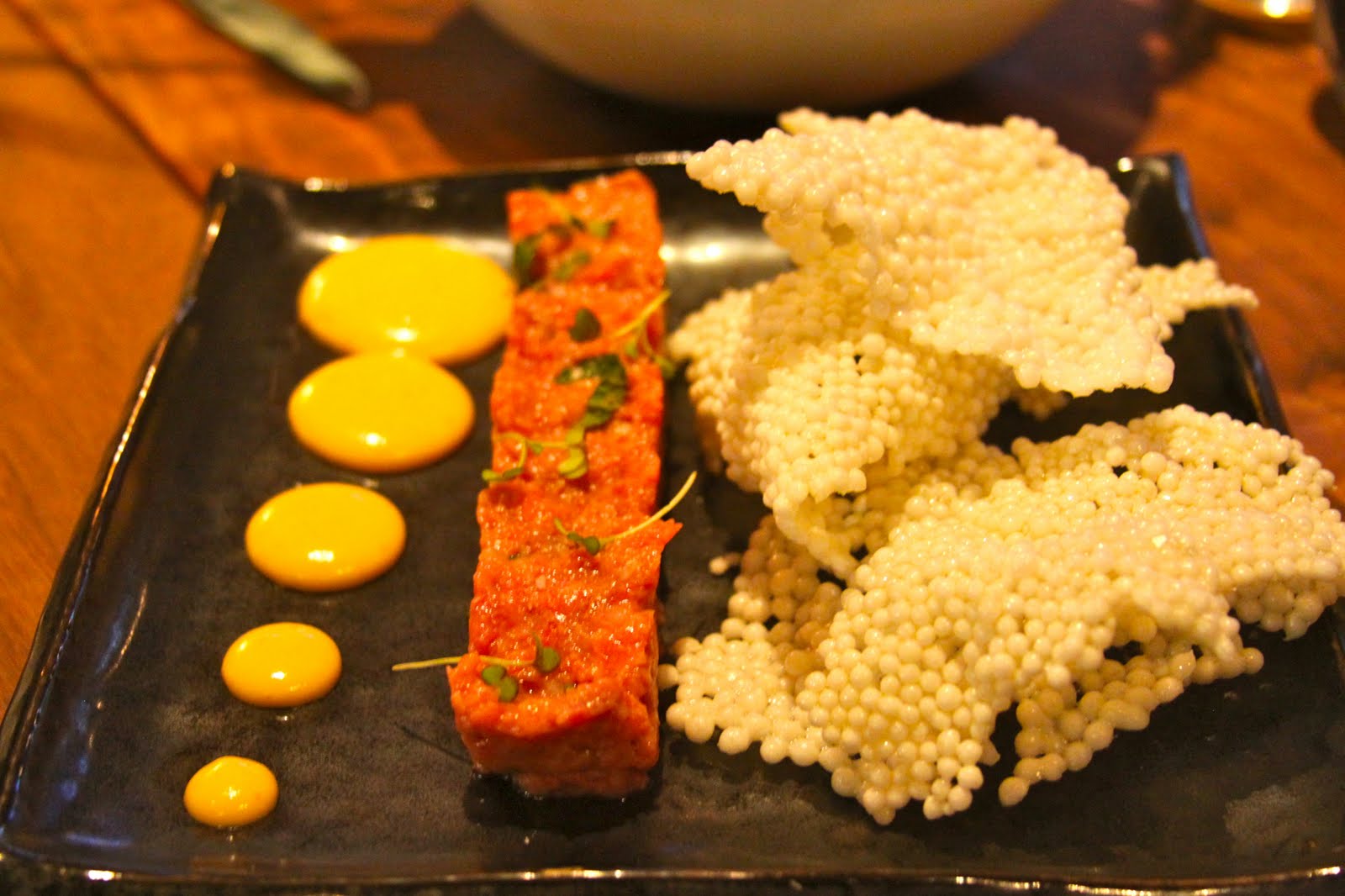 Appetizers: We shared some pork belly skewers with mustard ginger, crab rolls and beef tartar. So delish.
