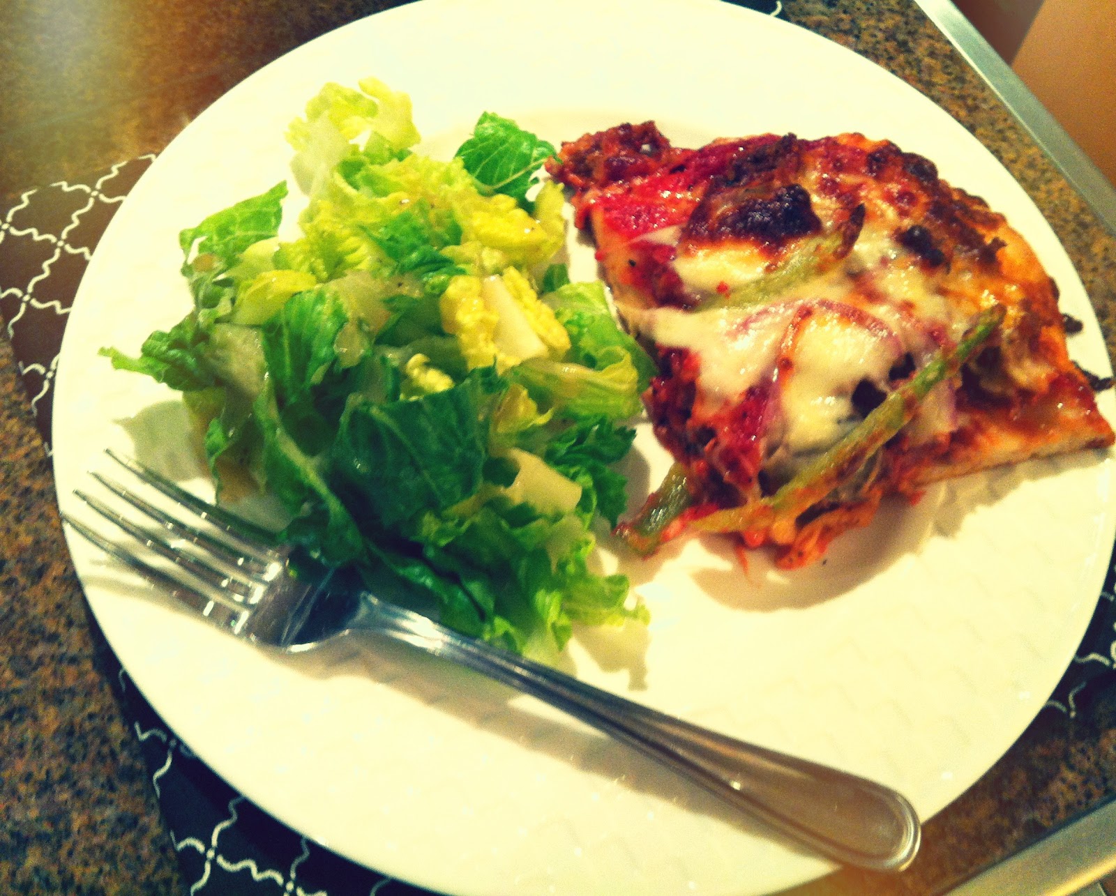 Dinner tonight was slapped together in less than 30 minutes – homemade pizza and salad. Store bought pizza dough is a life savor. I have yet to try and make actual homemade dough in fear of it not rising due to high altitude. Well, and I lack the patience, but that’s not the point.